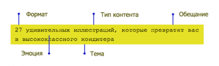 - Вставлять от 3 до 5 базовых элементов (эмоция, контент, тема, формат, обещание).