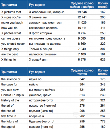 В этом блоке показаны выводы на основании ресерча по популярным заголовкам с выделением часто встречающихся триграмм. В рамках исследования были взяты приблизительно 100 миллионов рандомных статей из популярных ресурсов, далее отсеяны те, которые используются как минимум в 150 текстах и отсортированы по просмотрам. Таким образом были найдены самые часто используемые трех-словные конструкции.