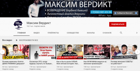 Но основная цель существования канал Вердикта — лить трафик на его «личный оффер» по возврату бывших. Хотя темы его видеороликов незамысловатые в духе «Как мужчины ведутся на женские провокации» или «Легкий способ забыть бывшую девушку», об их популярности говорит тот факт, что у Максима редкий ролик набирает меньше 50 000 просмотров, а зачастую они набирают более 100 000 просмотров.