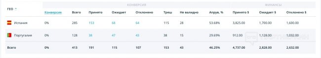 Для тестов мы просто перенесли наши текущие подходы с Италии и Румынии, что дало на этих двух ГЕО разный результат. Испания показал себя очень хорошо и в плане цены лида в плане аппрува. Португалия же наоборот. Да, минуса не было, но и плюс по этому ГЕО был минимальный.