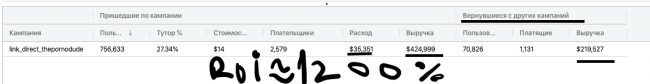 Итого мы получили ROI 1200%+ без учета возвратов, которые составили еще 600%, что в сумме 1800% на достаточно больших объемах.