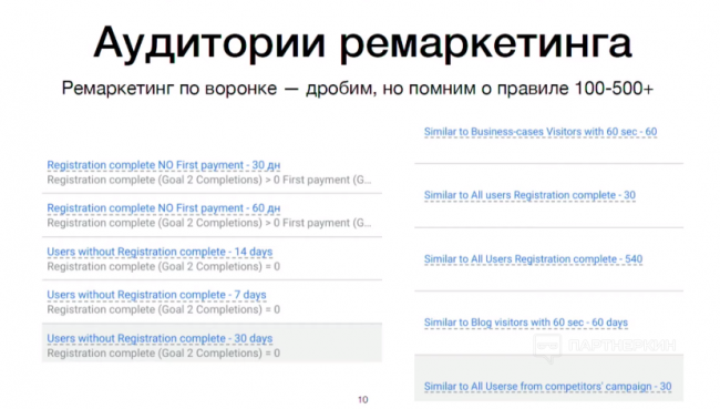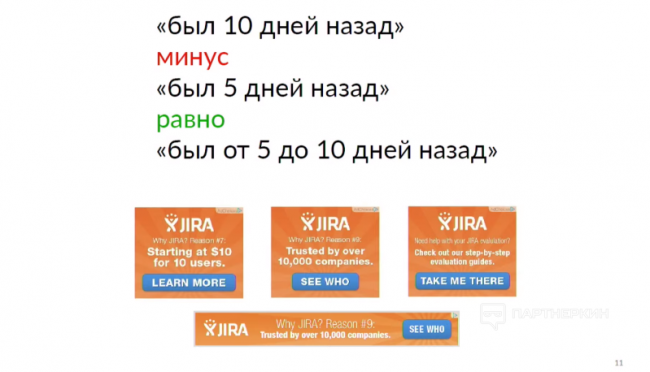 Также можно создавать аудитории по срокам. Например, группы: «был 10 дней назад» и «был 5 дней назад». Исключаем аудитории и получаем новую группу — пользователи, которые были на сайте от 5 до 10 дней назад. Подобным образом можно разным аудиториям показывать разные месседжи о том, почему стоит использовать наш продукт или услугу, в течение месяца. С помощью этого приема одному пользователю транслируют разные объявления с одинаковым посылом до 80 раз. А если это человек, принимающий ключевые решения или влияющий на их принятие? Считайте — попали в точку.