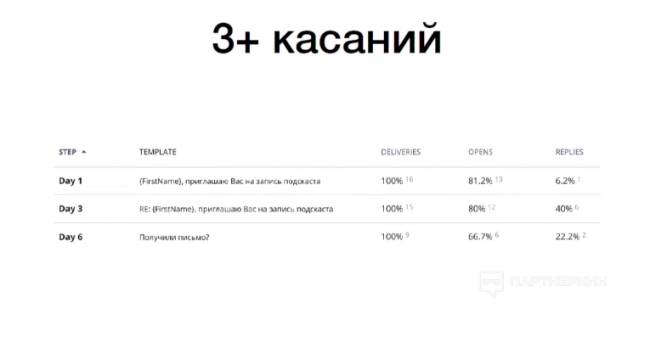 Еще одно из основополагающих правил — минимум 3 касания с каждым пользователем. Когда я запускал подкаст «Продуктивный Роман», отправлял цепочки писем знакомым. То есть теплой аудитории. На первое письмо был получен всего 1 отклик, на второе уже 6 и на третье, напоминающее, — 9 откликов. Представьте, если бы было отправлено всего одно сообщение. Если грубо: на 1000 собранных e-mail можно получить 1+ продаж.