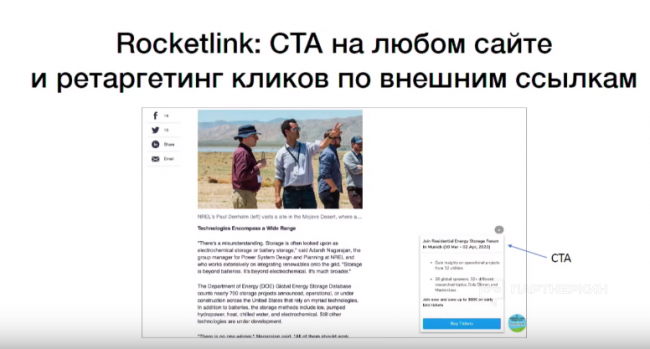 Сервис Rocketlink позволяет бесплатно разместить CTA на любом сайте. С помощью этого можно переливать трафик. Например, в своей рассылке сообщать пользователям о новостях в вашей нише и ставить ссылки на ресурсы, где они размещены. С помощью этого вы не тратите время на оптимизацию и рерайт контента, а также его размещение на своей площадке. Далее в углу стороннего сайта появляет CTA с напоминанием, что нужно зарегистрироваться на вашей площадке, посетить конференцию или попробовать демо-версию продукта. Можно даже вести пользователей из рассылки на популярные ресурсы. Например, Amazon или Rozetka. Затем все, кликнувшие по ссылке, попадают в списки для ретаргетинга — получаем дополнительные теплые аудитории для рекламы.