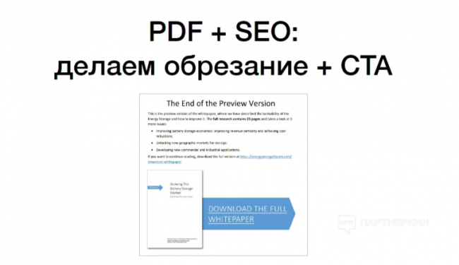 Юзаем перепаковку контента. Например, мы обнаружили, что у клиента неплохо ранжируется PDF файл, но Google отдает документ полностью. Обрезаем файл, делаем превью, добавляем SEO описание и CTA с призывов скачать вторую половину по подписке.