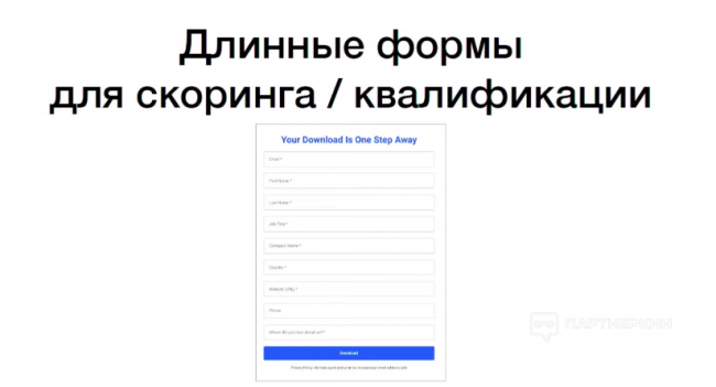 В B2B нише рационально использовать длинные формы регистрации. Они позволяют точнее персонализировать пользователя и отсечь лишнюю аудиторию, которая может съедать половину рекламного бюджета.