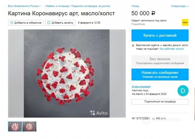 Искусство защитит от инфекции. Например, вот эта картина на Avito. Всего 50 000 рублей — и ваш дом в безопасности.