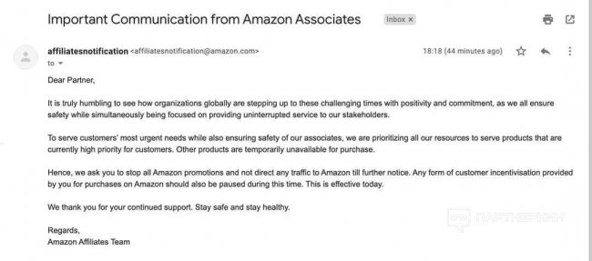 Сегодня некоторым вебмастерам, работающим с Amazon, пришло письмо с уведомлением, которое просит их остановить любую рекламу товаров и не направлять трафик на платформу. Такое решение объясняется с тем, что компания сосредоточила все усилия на товарах первой необходимости и что остальные продукты в настоящее время недоступны.