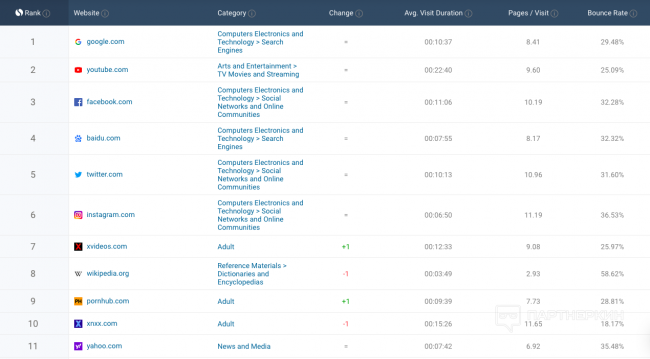 7 и 9 позиции в списке самых посещаемых сайтов занимают порносайты. Тогда как еще в январе XVideos был на 67 позиции.