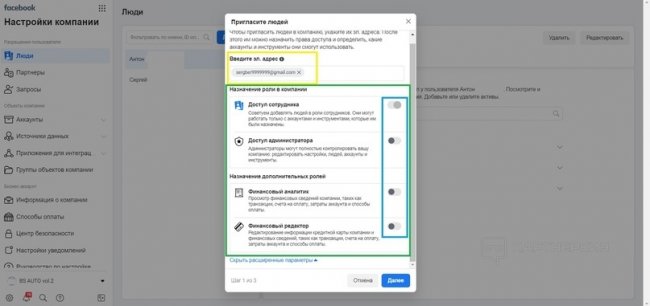 Нужно выдать роль. Вписываем email человека, которому нужно выдать доступ, эта почта должна быть привязана к странице Facebook. Как правило, зачастую, дается доступ сотрудника, это дает основной набор инструментов таргетологу, но и ограничивает его в некоторых моментах (например, он не сможет руководить лимитом затрат)