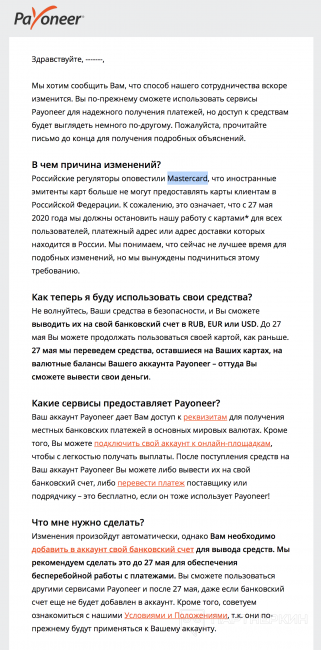Payoneer сообщил своим пользователям, что «способ их сотрудничества вскоре изменится». Начиная с 27 мая, платежная система перестанет доставлять карты в Россию. Более того, пользователи Payoneer, чей адрес доставки или платежный адрес находятся в России, не смогут использовать карту в стране. На данные меры, как объясняет Payoneer, пришлось пойти из-за решения российских регуляторов запретить иностранным эмитентам выдавать свои карты российским пользователям. C 27 мая пластиковые карты клиентов Payoneer в России станут бесполезными.