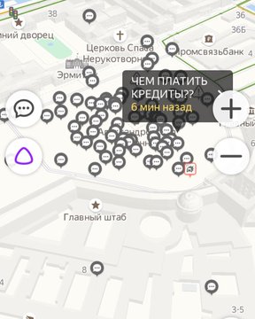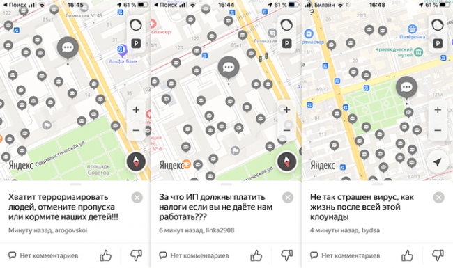На карте "Яндекса" быстро появились комментарии: "Выплатите людям пособия!", "Покормите моих детей", "Хотим кушать! Работы нет!", "Или ЧС, или платите кредиты и коммуналку сами!" Пользователи оставляли их с помощью функции "Разговорчики" внутри приложения - обычно с ее помощью участники движения сообщают о ДТП или оставляют комментарий об объекте на карте. Сегодня через нее жители пытались отменить пропускной режим.