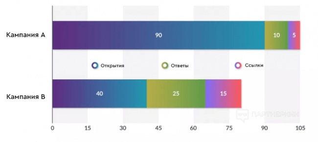 В кампании А прекрасный процент открытия, но ужасное количество обратных ссылок. В кампании B все гармонично. Если бы мы постоянно следили за процентом открытий писем, то дело бы однозначно выгорело.