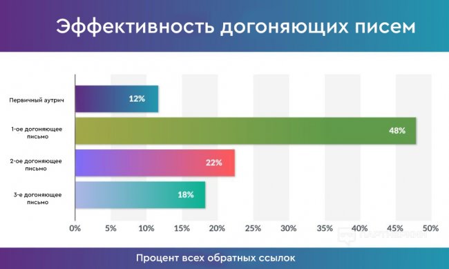 Нам всегда казалось, что догонящие письма — своего рода спам. Однако каким было наше удивление, когда мы посмотрели на результаты. За все время мы получили на 40% больше обратных ссылок, отправляя в среднем по 3 догоняющих письма. Промежуток между письмами — 5 дней.