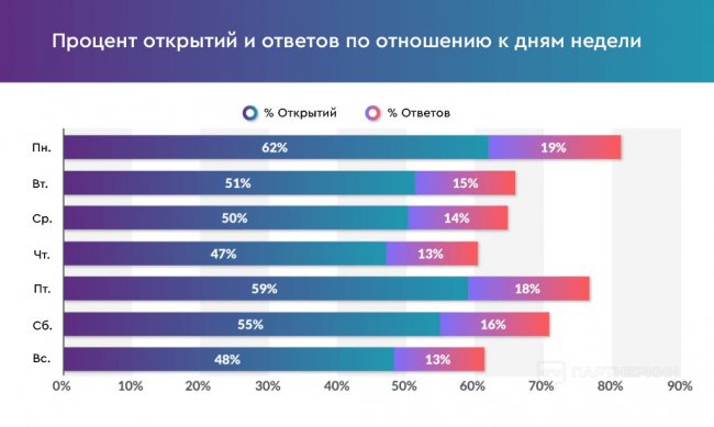 - Лучшие дни для рассылки — понедельник и пятница. Худшие — четверг и воскресенье.