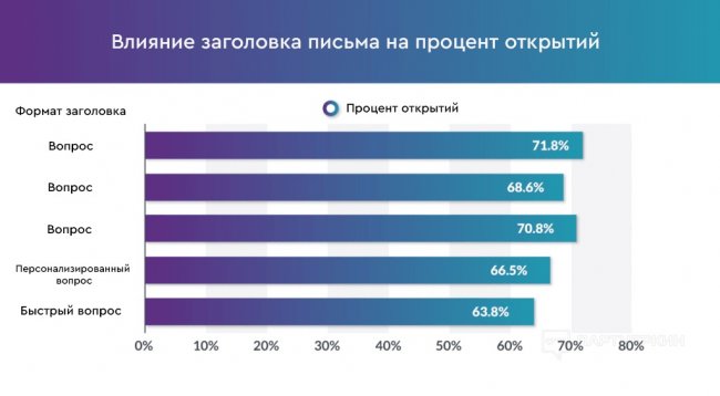 Примечательно, что во всех трех кампаниях с самым высоким процентом открытия использовался стандартный шаблон заголовка: «Вопрос?». Для догоняющих писем в этих компаниях шаблон оставался тем же.