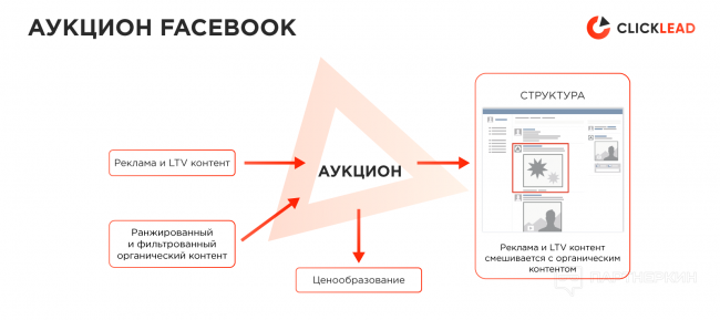 При подготовке рекламной кампании, вы настраиваете таргетинг. Например, самый базовый — пол, возраст, семейное положение. Так вы создаёте портрет вашей целевой аудитории. Один и тот же пользователь может быть среди целевой аудитории вашей и чужой рекламной кампании, в зависимости от настроек таргетинга. Тогда, ваше объявление и объявление какого-то другого рекламодателя, для которого этот пользователь является целевым, вступают в аукцион. В результате аукциона будет определено, чьё объявление человек увидит. Сам же механизм аукциона определяет нужно ли и где вставлять рекламу в уже отсортированный органический контент.