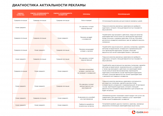 Обратите внимание, что каждое ваше объявление оценивается по трём параметрам и оценка ставится по каждому из критериев. Значит, если ваша оценка ожидаемого коэффициента конверсии выше среднего, но оценка качества рекламного объявления ниже среднего по 20%, то 80% чужих объявлений будут считаться лучшими по качеству. Вы можете провести диагностику актуальности рекламы, которая поможет оценить ваше объявление по этим трём параметрам.