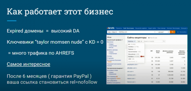 Многие реселлеры продают ссылку на этом сайте, но давайте посмотрим на проблему. На самом деле у этого продавца все домены — expired, поэтому у них высокий авторитет. Если посмотреть на трафик по ключевикам, то это, как правило, не популярные ключевые слова c keyword difficulty=0. Например, «taylor momsen nude». Они получают много трафика по ahrefs, но сам по себе, он не ценный, некоммерческий. После 6 месяцев, а это гарантия PayPal, этот сайт ставит ссылки в nofollow. Если посмотреть по ahrefs все его акцепторы, то в nofollow уже почти 12 тысяч доноров.
