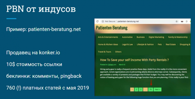 Следующий тип ссылок — PBN. В этом случае можно привести пример сайта patienten-beratung.net, как одного из лотов на konker.io. У продавца 1 000 положительных отзывов, а стоимость ссылки варьируется в районе 10 долларов. Площадка, на которую вам ставят ссылки, — это сайт, сделанный под все ниши. Тут и бизнес, и travel. Они постят все статьи подряд. С мая 2019 года по сегодняшний день размещено 760 платных материалов. Если посмотреть обратные линки, выяснится, что сайт ничего из себя не представляет. Это просто спам. Подобное может работать, если вы получаете ссылку с главной страницы сайта, но, постепенно, она уходит вглубь. Позже вы просто теряете вес линка.