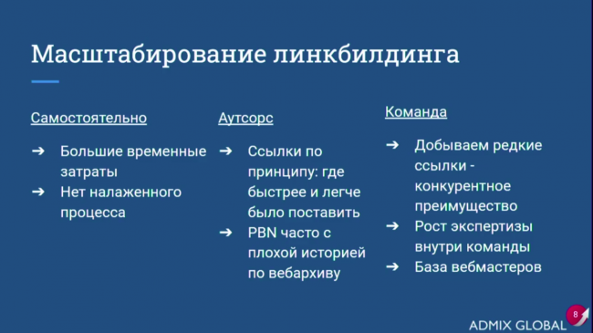 Ранее мы с командой покупали ссылки на аутсорсе. С этим был ряд проблем, о которых упоминалось выше. Сейчас мы делаем все самостоятельно. Это позволяет добывать редкие ссылки. К тому же, растет экспертиза внутри команды и собственная база вебмастеров. Теперь мы уже понимаем, на каких сайтах стоит размещаться.