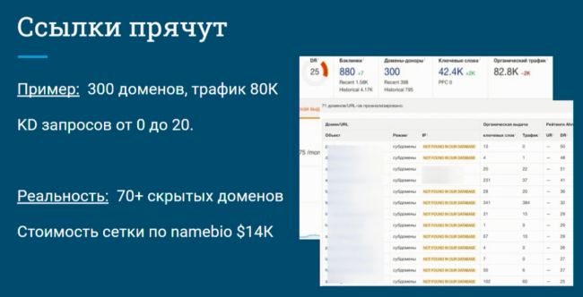 Следующий момент, который нужно учитывать при выборе площадки — ссылки прячут. На скриншоте ниже площадка, у которой 300 доменов по ahrefs, а Keyword Difficulty запросов от 0 до 20. На самом деле, если анализировать сайт глубже, у него более 70 скрытых доменов. Стоимость такой сетки по namebio $14 000. Вывод: не стоит просто смотреть на Keyword Difficulty, нужно копать глубже.