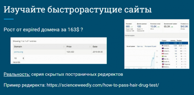 С помощью анализа быстрорастущих сайтов можно получать инсайты о том, что работает прямо сейчас. Очередной пример: можно подумать, что сайт растет благодаря expired домену за 163 доллара. На самом деле, причина в серии скрытых постраничных редиректов. По ahrefs вы эти редиректы не увидите.