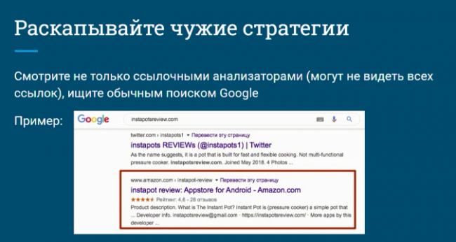 Популярные ссылочные анализаторы не видят всех ссылок. Ищите обычным поиском в Google. На примере сайт instapot review, на котором мы нашли ссылка на Amazon в поисковой выдаче.
