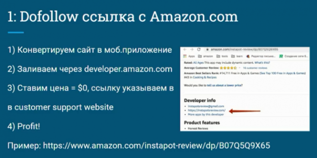 Подумаем, как площадка могла получить подобный линк. Наверняка способ нестандартный. В большинстве случаев ahrefs не показывает ссылки с Amazon, потому что сайт огромный. Но обычный поиск в Google их находит. В данном случае, ребята сконвертировали сайт в мобильное приложение, которое просто залили на Amazon. Через кабинет девелопера поставили цену 0, а в поле customer support website указали ссылку — получили dofollow линк с Amazon.