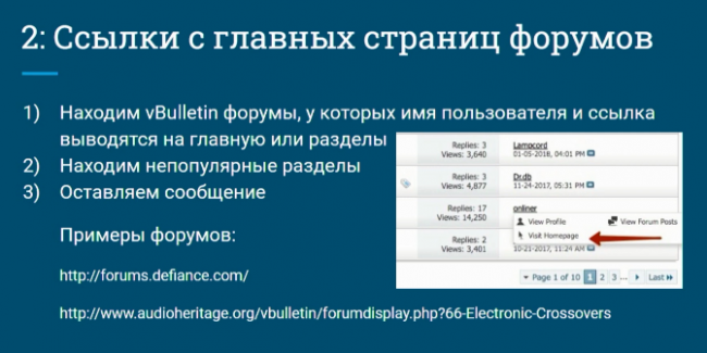 Еще один из методов — получение ссылок с главных страниц форумов. Находим форумы на популярном движке vBulletin и ищем пользователя, чей профиль выводится на главную страницу сайта. Смотрим его не популярные разделы, в которых редко что-то пишут. В последних оставляем сообщение и попадаем на главную страницу форума — вновь получили Dofollow ссылку. Примеры форумов можно увидеть на примере ниже.