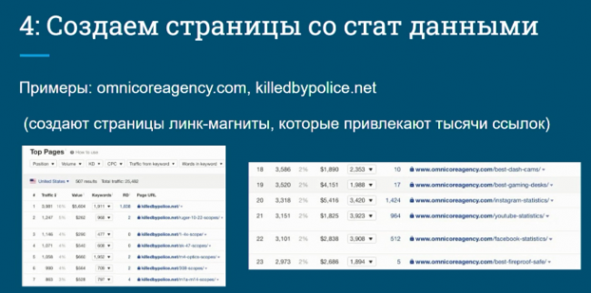 Четвертый способ получения обратной ссылки — создание страницы со статистическими данными. Разберем два интересных примера. Ребята с сайта omnicoreagency.com собрали статистику по YouTube и Facebook: сколько пользователей и как растут эти проекты. На подобные страницы стали ссылаться десятки площадок. То есть у них постоянно растут обратные линки на страницы со статическими данными. С помощью этого они нарастили траст площадки количеством ссылок. Сейчас ребята уже размещают обзоры под Amazon.