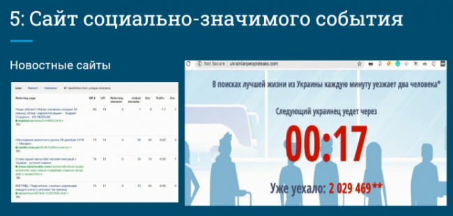 Еще один пример получения ссылок — сайт социально-значимого события. На скриншоте ниже площадка о том, сколько украинцев покинули страну в поисках лучшей жизни. По большому счету, это просто одностраничник с счетчиком. Ничего сложного в нем нет. Однако этот сайт в свое время получил десятки очень мощных ссылок. Среди них: минфин, крупные международные обозреватели и подобные.