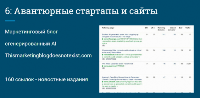 Ссылки можно получать с помощью авантюрных стартапов. Например, блог, контент на котором сгенерирован полностью искусственным интеллектом. Данный сайт получил 160 доменов доноров — это новостные и крупные серьезные издания. Подробный проект мог сделать почти любой.