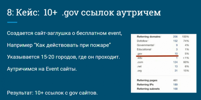 Еще один пример как получить gov-ссылки. В данном случае — это event. Создаем социально-значимый event, например, как действовать при пожаре. Указываем города, в которых он будет проведен и аутричимся на event-сайты. С помощью этого можно получить от 10 ссылок с gov-площадок.