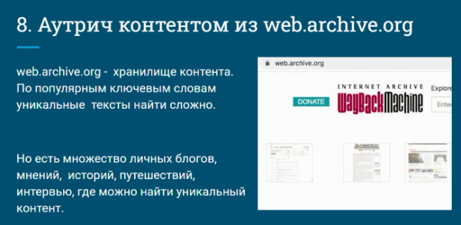 В большинстве случаев полезно смотреть на конкурентов. Именно так появился аутрич контентом из web.archive.org. Не секрет, что в web.archive.org есть множество уникального контента. Конечно, по популярным ключевым словам уже все занято и найти там уникальные тесты невозможно. Но есть множество личных блогов, историй или интервью, где уникального контента достаточно.