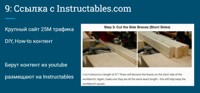Девятый способ — ссылки с instructables.com. Естественно, здесь вы можете находить аналогичные проекты. Просто instructables.com довольно крупный сайт. У него 25 миллионов посетителей в сутки по similarweb. Он публикует инструкции и мануалы. Берем контент и картинки из YouTube и размещаем на instructables.com, как свою инструкцию. По сути, чужой контент, но ставим ссылку на свой сайт.
