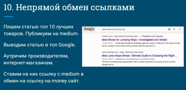 Часто непрямой обмен ссылками дает хорошие результаты. Например, пишем статью по топ-10 лучшим товарам, затем публикуем ее на medium. Это довольно трастовая площадка. Выводим материал в топ и аутричимся с производителями или интернет-магазинами. Предлагаем им ссылку с medium в обмен на ссылку на наш money-сайт.