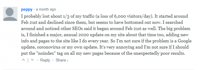 60% опрошенных говорит об ухудшении органического трафика. А некоторые отзывы вообще говорят о падении более чем на 6 000 пользователей в день: