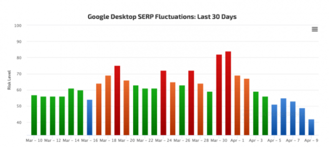Изменчивость показателей Google подтверждает еще одно исследование по анализу отклонения Google от плановых показателей. Большая часть марта наблюдалась красная зона риска, но к середине апреля наблюдается тенденция улучшения: