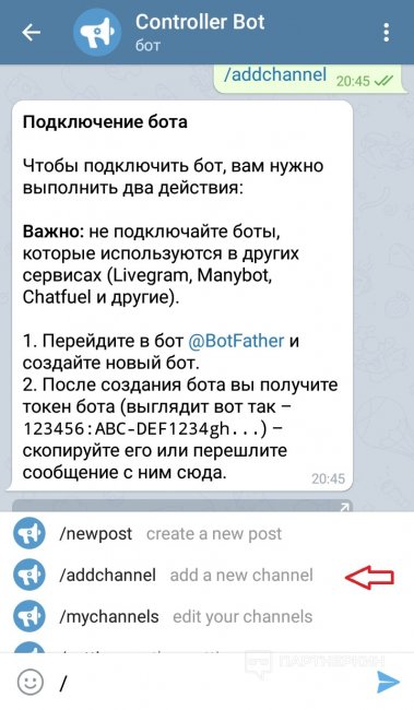 Заходим в Controller Bot и выбираем команду "addchanel" и вставляем туда токен, который мы скопировали ранее из Bot Father. Можно сразу забить описание бота либо пропустить этот шаг.