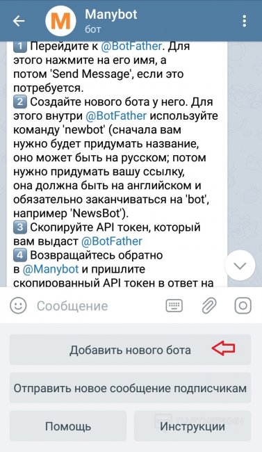 Заходим в ManyBot и выбираем пункт "добавить нового бота" и вставляем скопированный API токен с BotFather.