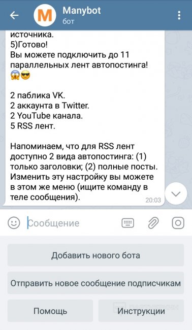 Потом также добавляем в администраторы нашего нового бота. В ManyBot выбираем пункт /autoposting . Можно выбрать до 11 разных источников, посты с которых будут автоматически репоститься в наш канал. Только нужно соц. сети перевести в RSS ленту. Это можно сделать с помощью, например, https://www.mysitemapgenerator.com/
