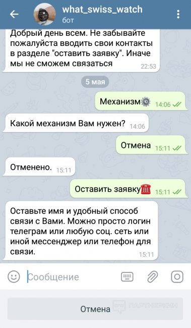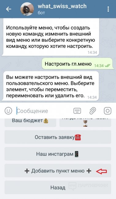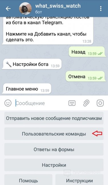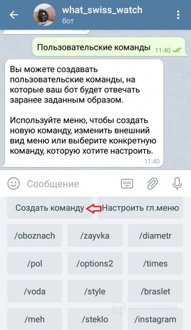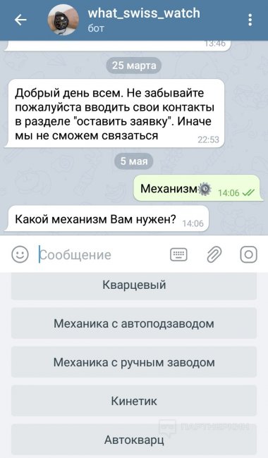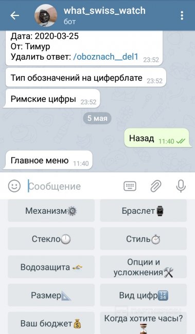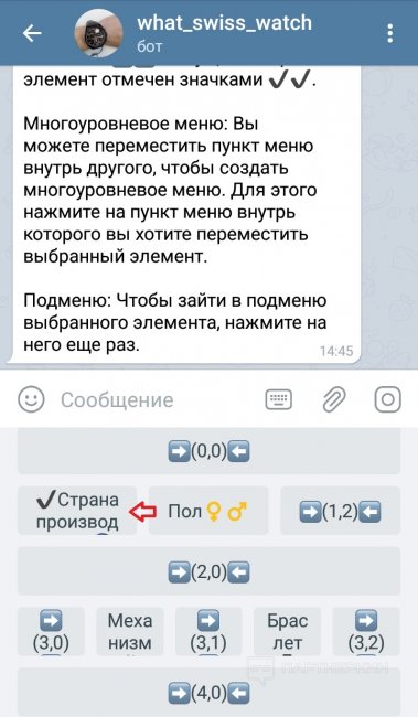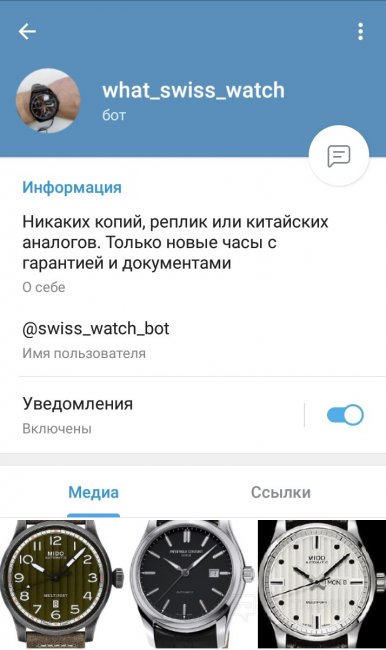 Покажу на примере простого созданного мной бота t.me/swiss_watch_bot