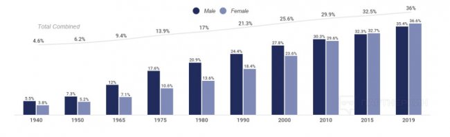 Процент американцев старше 25 лет с 4+ годами колледжа 1940-2019.