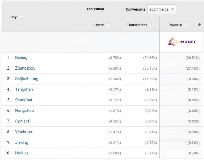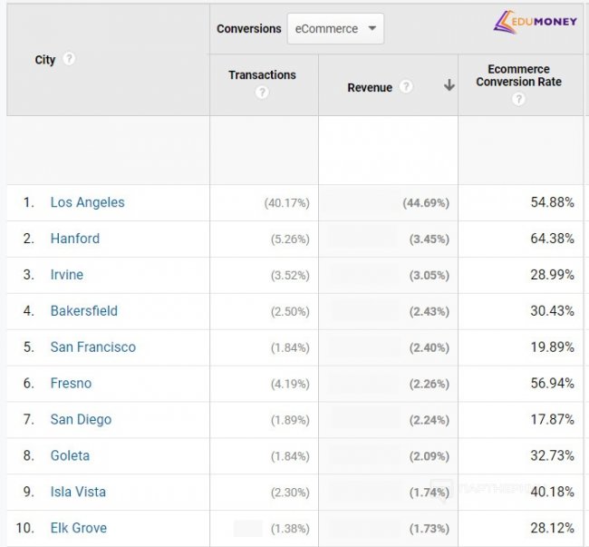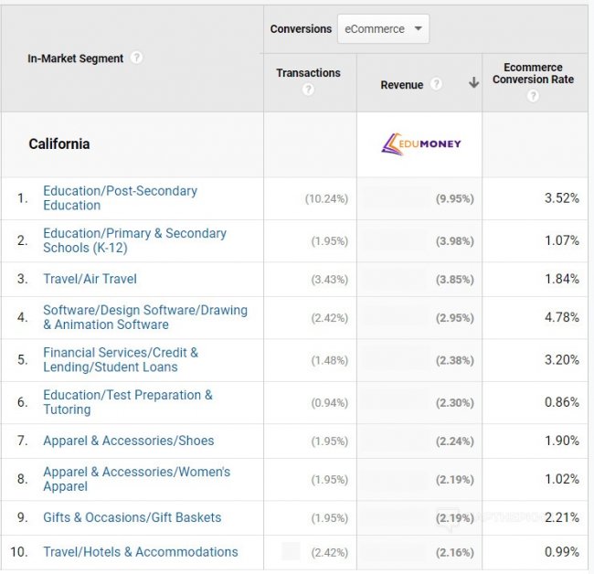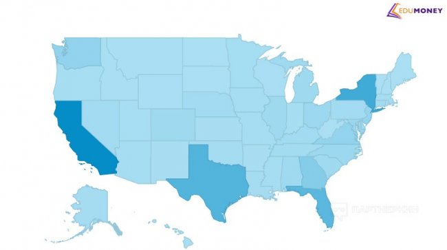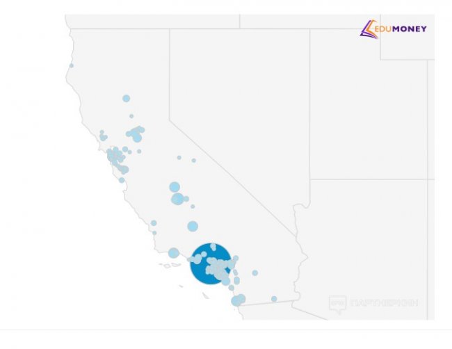 Углубившись, можно увидеть, что почти половина (44.69%) - это один Лос Анджелес. Данный город приносит четверть прибыли в нише, поэтому конкуренция за рекламу в поиске на данное ГЕО огромная. Но есть города в штате Калифорния, которые тоже приносят прибыль, но конкуренция по добыче студенческого трафика в данных городах намного ниже, а платная реклама в поиске дешевле: