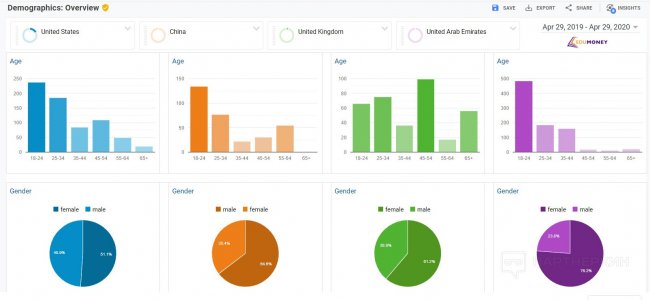 Графики сравнения демографической статистики по прибыльности между США, Китаем, Британией и ОАЭ.