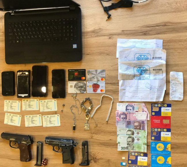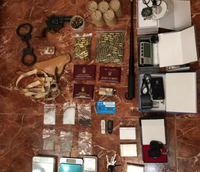 Во время задержания сотрудники органов изъяли 9 пистолетов различной модификации, патроны, униформу, удостоверения, наручники, дубинки, более $35 000, банковские карты и большое количество наркотиков:
