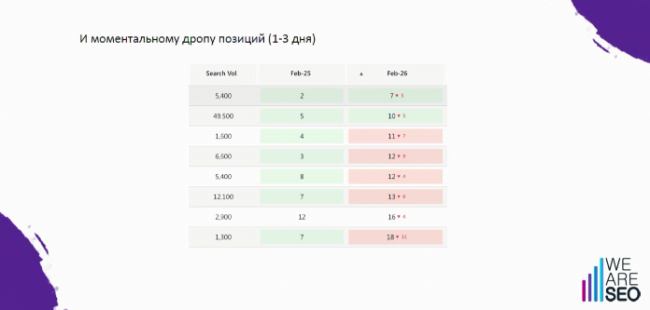 Если проанализировать поисковые запросы, то 25 февраля был пик, а 26 мы уже просели, причем упали не только высокочастотные, но и среднечастотные с низкочастотными. Это срабатывает буквально за 3 дня.