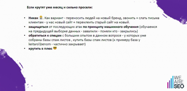 В ситуации, когда валят месяц и вы уже сильно просели, скорее всего никак не поможешь. Как вариант, можно переносить людей на новый бренд. Звонить и отправлять письма клиентам с уведомлением о том, что у вас новая площадка, или переклеить старый сайт на новый. Однако, какой от этого толк, если новый проект тоже будут валить.