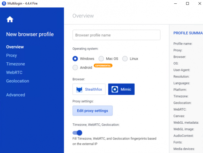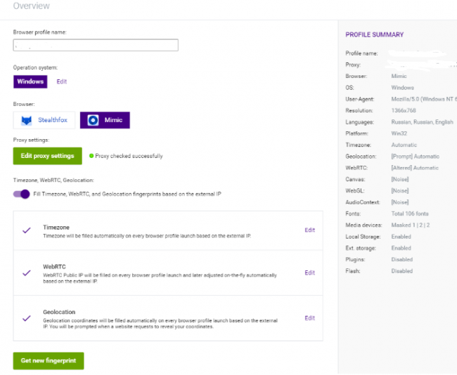 Для создания новой сессии, при нажатии New Browser Profile, делаем настройки ОС, браузера и вносим данные о прокси. Сессия создана.
